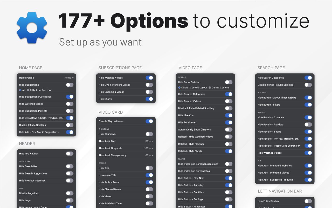 UnTrap for YouTube, Chrome, Firefox, Opera, Edge ve Safari gibi popüler tarayıcılara yüklenebilen güçlü bir tarayıcı uzantısıdır. 177'den fazla özelleştirme seçeneğiyle UnTrap for YouTube, YouTube deneyiminizi tercihlerinize uyacak şekilde özelleştirmenize ve izleme ortamınızın kontrolünü elinize almanıza olanak tanır. Tüm seçenekler basit bir geçiş anahtarı aracılığıyla kullanılır. Seçim kolaylığı için çeşitli kategorilere ayrılmıştır.