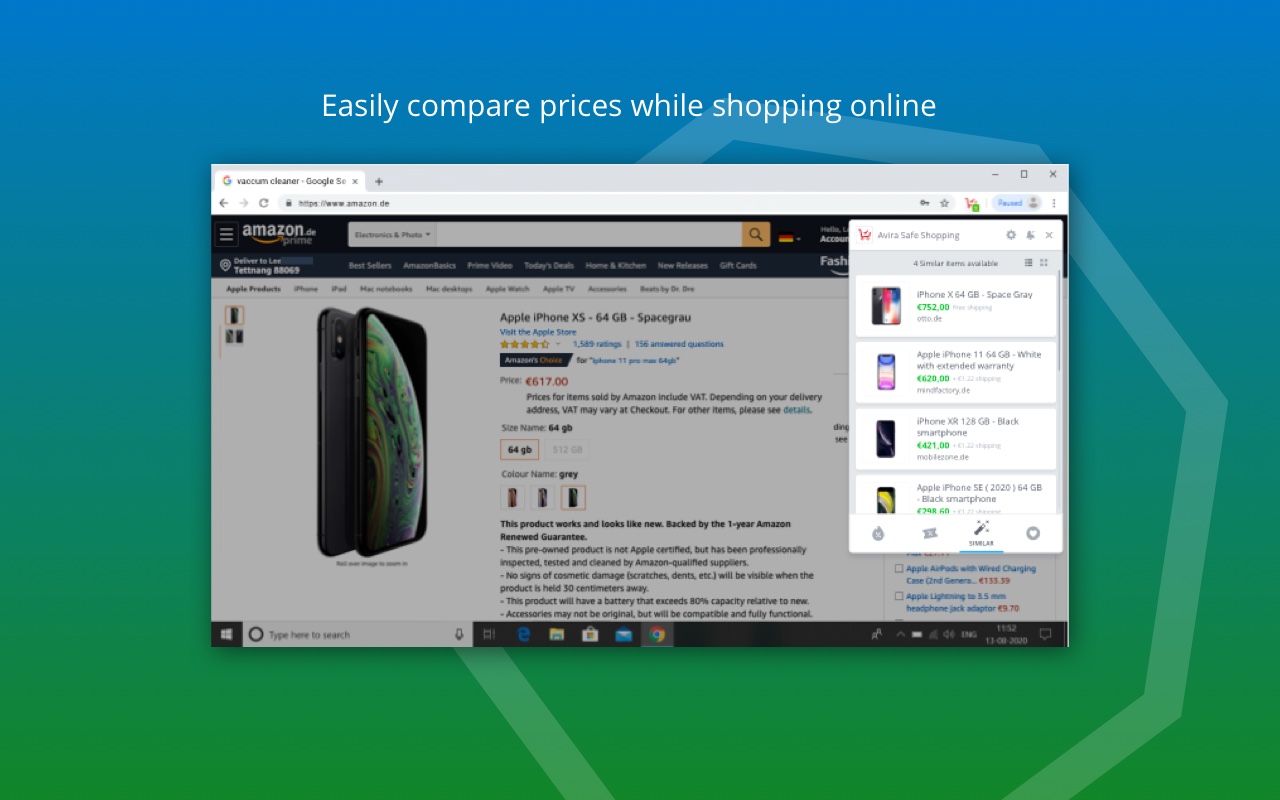 Avira Güvenli Alışveriş dikkat çekmez ve bir yerde alışveriş yapmaya başlayana kadar orada olduğunu bilemezsiniz. Ücretsizdir ve paradan tasarruf etmenizi sağlar, bu yüzden buna kazan-kazan diyoruz.