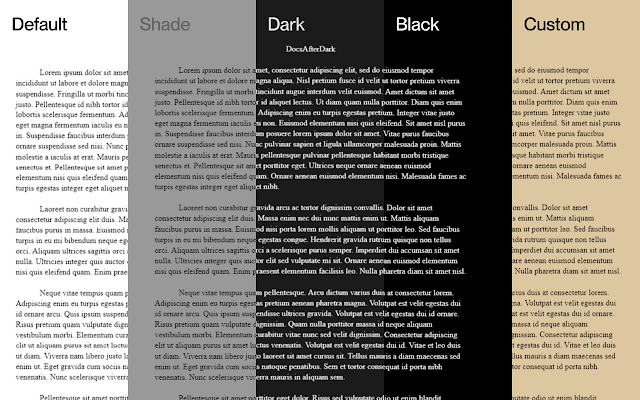 DocsAfterDark, önceden ayarlanmış seçenekler arasından basit bir seçim işlemiyle bir belgenin arka planını daha koyu bir gölgeye kolayca özelleştirir. Menüdeki özel renk seçeneğini de kullanabilirsiniz. DocsAfterDark seçenek menüsüne tarayıcı araç çubuğundaki simgeye tıklayarak erişilir. Resimler ve degradeler de dahil olmak üzere herhangi bir geçerli arka plan CSS değerini kullanabilirsiniz (bu özellik Chrome'da dengesiz olabilir).