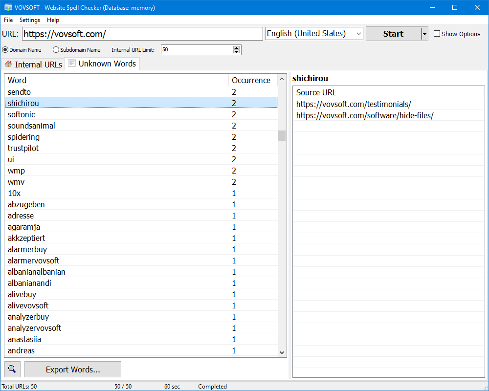 VOVSOFT Web Sitesi Yazım Denetleyicisi, sitenizde asla utanç verici yazım hatalarına yakalanmamanızı sağlar. VOVSOFT Web Sitesi Yazım Denetleyicisini kullanmak için web sitenizin adresini belirlenen "URL" alanına girin. Daha sonra "Başlat" butonuna tıklayın. Yazılım daha sonra yazım hatalarını tanımlayacak ve "Bilinmeyen Kelimeler" sekmesinde gösterecektir. Hata kodları gibi bazı kelimeler (iki numaralı ekran görüntüsünde gösterildiği gibi) yanlış yazılmayanları işaretleyecektir.